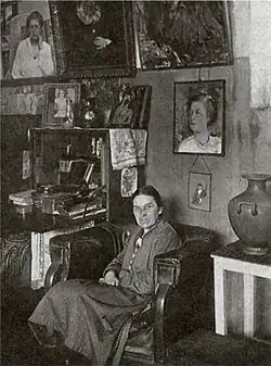 Varvara Vladimirovna Adoratskaya was born in Kazan in 1904. A year later, her father was arrested for revolutionary activities and was first imprisoned, then exiled from the Russian Empire (though the Adoratsky family returned to their homeland briefly in 1907, when a family photo was taken in S. Felzer's studio in Kazan).[13] Varvara and her mother followed her father into exile. The family lived in Switzerland and later in Germany. After the outbreak of World War I in 1914, Varvara and her parents were interned.[14] In 1918, following an exchange proposed by Lenin, the Adoratskys returned to Russia. The family settled in Moscow, where Vladimir Adoratsky began working in the Central State Archive,[13] and Varvara studied at Vkhutemas from 1923 to 1925.[15] The Adoratsky family lived in an apartment in the Government House (also known as the "House on the Embankment"). Varvara's mother was disabled from a young age, having lost her hearing and eyesight, and was barely able to move, so her daughter had to devote herself to caring for her. In her youth, Varvara herself suffered from tuberculosis and Graves' disease, which is presumably what prevented her from completing her university studies.[14]