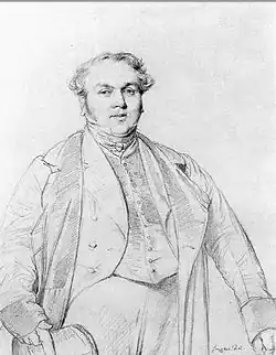 Louis-François Bertin was aged 66 when portrayed in 1832.[1] He had befriended Ingres either through his son Édouard Bertin, a student of the painter,[2] or via Étienne-Jean Delécluze, Ingres' friend and the Journal's art critic.[3] In either case the genesis of the commission is unknown. Bertin was a leader of the French upper class and a supporter of Louis Philippe and the Bourbon Restoration. He was a director of the Le Moniteur Universel until 1823 when the Journal des débats became the recognised voice of the liberal-constitutional opposition after he had come to criticize absolutism. He eventually gave his support to the July Monarchy. The Journal supported contemporary art, and Bertin was a patron, collector and cultivator of writers, painters and other artists.[4] Ingres was sufficiently intrigued by Bertin's personality to accept the commission.[2]
