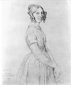 The final painting was completed during a month at Bertin's estate of retreat, Le Château des Roches, in Bièvres, Essonne. Ingres made daily visits while Bertin entertained guests such as Victor Hugo, his mistress Juliette Drouet, Hector Berlioz and Franz Liszt and Charles Gounod.[5] Ingres later made drawings of the Bertin family, including a depiction of his host's wife and their son Armand and daughter-in-law, Cécile.[6]