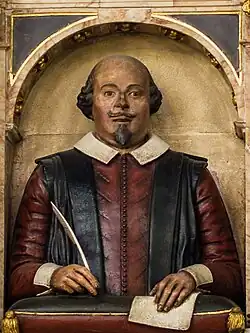 - The bust in Shakespeare's funerary monument, in the choir of Holy Trinity Church, Stratford-upon-Avon. This half-length statue on his memorial must have been erected within six years after Shakespeare's death in 1616. It is believed to have been commissioned by the poet's son-in-law, John Hall, and must have been seen by Shakespeare's widow Anne. It is believed that the bust was made by the Flemish artist Gerard Johnson.