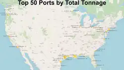 This is a list of ports of the United States, ranked by tonnage.[1] Ports in the United States handle a wide variety of goods that are critical to the global economy, including petroleum, grain, steel, automobiles, and containerized goods. See the articles on individual ports for more information, including history, geography, and statistics.