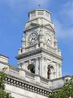 The current building was commissioned to replace an earlier town hall located in the High Street.[2] The site selected for the new building had been occupied by the home of the Commanding Officer of Artillery.[2] The foundation stone was laid by the mayor, Alfred Starling Blake, on 14 October 1886.[3] The building, which was designed by William Hill in the Neo-classical style, was officially opened by the Prince and Princess of Wales on 9 August 1890.[3]