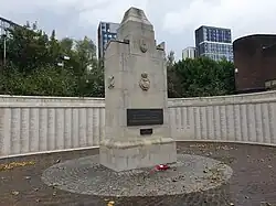 The City of Portsmouth War Memorial, also referred to as the Guildhall Square War Memorial, is a First World War memorial in Guildhall Square in the centre of Portsmouth, Hampshire, on the south coast of England.[1] Portsmouth was and remains a port and home to a major naval dockyard. The dockyard and the armed forces provided much of the employment in the area in the early 20th century. As such, the town suffered significant losses in the First World War. Planning for a war memorial began shortly after the end of the conflict and a committee was established for the purpose. It selected a site adjacent to a railway embankment close to the Town Hall (renamed the Guildhall in 1926 when Portsmouth was granted city status) and chose the architects James Gibson and Walter Gordon, with sculptural elements by Charles Sargeant Jagger, from an open competition.