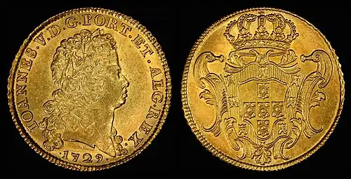 ; not to be confused with the 20th-century currency) were issued from 1722 to 1800 in denominations of 1⁄2, 1, 2, 4 and 8 escudos.