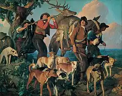 Manuel Benedito's 1913 painting Return from the big game hunt, showing a pack of Podengos in Spain.