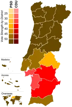 The PSD was reelected in a landslide, winning a majority government with just over 50 percent of the votes and 148 of the 250 seats, a majority of 46. Not only was this the most seats that a Portuguese party had ever won in a free election, but it was first time since the Carnation Revolution that a single party won an absolute majority. Although the PSD was very popular going into the election, the size of its victory far exceeded the party's most optimistic expectations. The PSD won every district with the exception of Setúbal, Évora and Beja, which voted for the CDU.