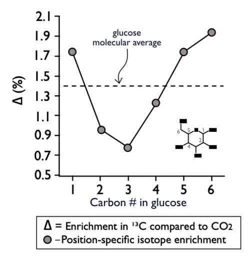 In 2012, a team of scientists used NMR spectroscopy to measure all of the position-specific carbon isotope abundances of glucose and other sugars. It was shown that the isotope abundances are heterogeneous. Different portions of the sugar molecules are used for biosynthesis based on the metabolic pathway an organism uses.[12] Therefore, any interpretations of position-specific isotopes of molecules downstream of glucose have to consider this intramolecular heterogeneity.