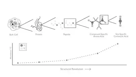 These variations can occur on a compound-specific level, but also on a position-specific level within a molecule. For instance, the carboxyl site of amino acids is exchangeable and therefore its carbon isotope signature can change over time and may not represent the original carbon source of the molecule.