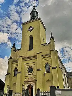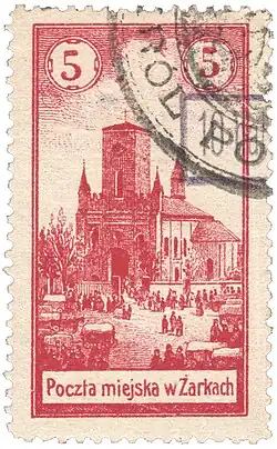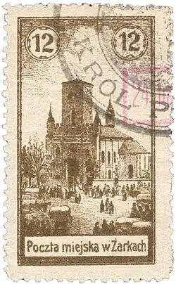 At the time of World War I, Żarki belonged to the district of Dąbrowa. On August 27, 1918, the Żarki city council requested permission from the officer in charge of Civil Affairs[1] to create a local post.[2] On September 18, 1918, the city council requested permission to collect delivery payments and issue stamps.[3] The district military command issued permit number 13. 138. V. A. on September 30, 1918 and requested 5 stamps of each denomination as samples.[3] The post began and ended operation shortly after in October, 1918, only having issued one stamp design featuring the Żarki Catholic church.[1]