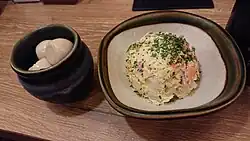 Potato salad is generally served cold or at room temperature. Ingredients often include mayonnaise or a comparable substitute (such as yogurt or sour cream), herbs, and raw vegetables (such as onion and celery, dill).[3] South German-style potato salad is served warm or at room temperature and is made with a vinaigrette (rather than a creamy mayonnaise-based dressing), and typically includes bacon.[4] North German potato salad is served cold or at room temperature. It is typically made with mayonnaise, hard-boiled egg and sweet or sour pickles. The American-style potato salad is likely to have originated from this version.[5] Asian-style potato salad is similar to American-style potato salad, but has a sweeter and eggier flavor.