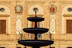 From 1745, it was rebuilt by the architect Pietro Bernasconi, the main assistant of Luigi Vanvitelli. In the following century, the building underwent more renovations and transformations. The council hall, entitled to the first mayor after the fascism, Antonio Carestia, houses three pieces of art: the canvas “Madonna con Bambino tra i Santi Martino e Rocco” (1584) (Mary with Child among Saints Martin and Roch) by Simone De Magistris, “Allegoria della Pace” (18th century) (Allegory of Peace) by Corrado Giaquinto and “Sant’Emidio” (1770) (Saint Emygdius) by Benedetto Biancolini.