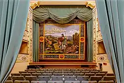 The construction, finished on 20 December 1859, was entrusted to the architect Brandoni. The painter Filippo Persiani concluded the decoration of the theatre after the Unification of Italy. To celebrate the event, in the centre of the ceiling, he painted the coronation of a woman, the personification of Italy. The building, with its capacity of 152 seats, was opened to the public in occasion of the 1862 Carnival. On 28 October 1933, the theatre was entitled to the well-known musician Bruno Mugellini from Potenza Picena. The theatre curtain, approximately 7 metres large and 5 metres high, depicts a mythological scene with the Greek goddess Minerva. Above the representation there is the coat of arms of the Royal Savoy Family, to honour the Unification of Italy, while on the bottom there is the Potenza Picena one.