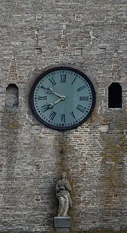 The current square building, which ends with a small terrace, 34.50 metres high, is the result of the last restoration work. On 11 January 1886, lightning hit the octagonal pinnacle, which was 46.90 metres high, approximately 12.40 metres more than the current roof's height. The lightning damaged two of the four bells of the tower and the clock. To avoid further damage by climate factors, a lightning rod was installed. In 1943, the bells were removed and melted down for military purposes, so on 21 May 1951 some new ones were collocated in the original position. On 30 June 1944, a German cannon shot from the hill of Recanati hit the belfry, killed five people in the Potenza Picena square and destroyed the commemorative plaque of the fallen of the First World War. This plaque was renewed with the addition of the names of the fallen during the Second World War and those of the local partisans Mariano Cutini and Mariano Scipioni. In 1955, in occasion of the Potenza Picena proclamation as “Città di Maria” (City of Mary), a terracotta statue depicting Our Lady of the Assumption, made by the sculptor Giovanni (known as Nino) Patrizi from San Ginesio, was collocated on the belfry façade. In 1968, for the 50th anniversary from the end of the Great War, another memory plaque was embedded. Finally, on 25 April 2000, another commemorative plaque was collocated to honour the eight people who died on 30 June 1944 due to two German cannon shots.