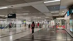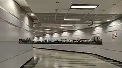 Commissioned as part of the MRT system's Art-in-Transit Programme,[b] Point of View by Matthew Ngui is a series of anamorphic images and text displayed all around the station. These texts and images, or according to the artist the "macro view of the images with the microcosmic perspective of the text", gives the work aesthetic interest and depth.[29][30] The seven images include a row of Housing Development Board (HDB) apartments displayed along a passageway, a tree at the north side of the concourse and a bus stop at the south side of the concourse. On the platforms, there are four images of clocks set at various times of day (morning, midday, evening and night) alongside some texts. These images were chosen to represent daily life.[30]