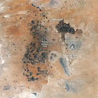 The central Aden-Afton field includes Aden, Afton, the Gardner cones, and the Kilbourne Hole and Hunt's Hole maars. The two maars erupted through portions of pre-existing Afton series basalt flows. The Afton flows may have erupted through a fissure upon which the Gardner cones were emplaced. Aden is a well-preserved shield volcano that at one time had a lava lake, which later solidified and partially collapsed to the west.[1][4] Its lavas have been dated as between 15 and 19 thousand years old.[3]