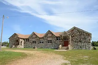 The Poughkeepsie School Building is a historic school building in Poughkeepsie, Arkansas, between Arkansas Highway 58 and Cherry Street. It is a single-story fieldstone building in the shape of an H, with front-gabled wings flanking a central horizontally-ridged section. The school was built in 1929–30, and is a well-preserved representative of a rural Arkansas stone school of the period.[2]