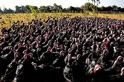 The majority of hens in many countries are housed in battery cages, although the European Union Council Directive 1999/74/EC[24] has banned the conventional battery cage in EU states from January 2012. As of April 1, 2017, no new battery cages are able to be installed in Canada.[25] Farmers must move towards enriched housing or use a cage-free system. In 2016, the Egg Farmers of Canada announced that the country's egg farmers will be transitioning away from conventional hen housing systems (battery cages) and have no conventional caging left by 2036.[26] Batteries are small cages, usually made of metal in modern systems, housing 3 to 8 hens. The walls are made of either solid metal or mesh, and the floor is sloped wire mesh to allow the feces to drop through and eggs to roll onto an egg-collecting conveyor belt. Water is usually provided by overhead nipple systems, and food in a trough along the front of the cage replenished at regular intervals by a mechanical system.