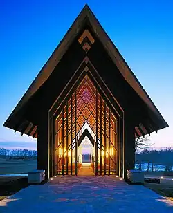 The iconic Marjorie Powell Allen Chapel is a 4,700 sq. ft. nondenominational wedding chapel that first opened in 1996. It was designed by architect E. Fay Jones and is made of mostly wood and glass.[1]