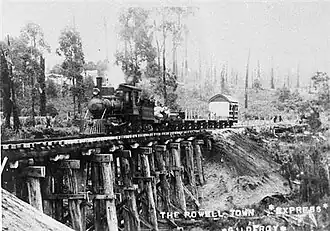 The 3 ft (914 mm) timber railway connected the 5 ft 3 in (1,600 mm) Victorian Railways at Yarra Junction. There was a sawmill in Powelltown, and the line ran from there to the forest areas further east. The track ran through a 313-metre (1,027 ft) tunnel, constructed in 1925, and over several large trestle bridges.[3][4]