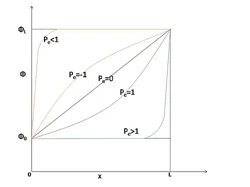 The variation between and x is depicted in Figure for a range of values of the Peclet number. It shows that for large Pe, the value of at x=L/2 is approximately equal to the value at upwind boundary which is assumption made by the upwind differencing scheme. In this scheme diffusion is set to zero when cell Pe exceeds 10.