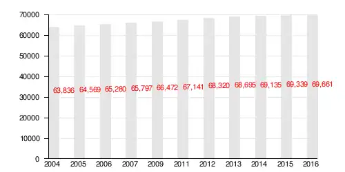 According to the Central Statistical Office data, the district's area is 23.42 square kilometres (9.04 square miles) and 69 135 people inhabit Prądnik Biały.[1]