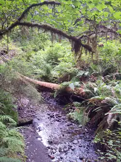 Prairie Creek is the Redwood Creek tributary drainage basin including the inland portion of Prairie Creek Redwoods State Park. Prairie Creek drains southerly through a Plio-Pleistocene non-marine sedimentary and metasedimentary formation to a confluence with Redwood Creek approximately one mile upstream of Orick, California. The southern half of the channel exposes the Franciscan Assemblage and the lower reaches flow through Quaternary alluvium of the Redwood Creek estuarine floodplain. Prairie Creek was closely followed by U.S. Route 101 from Orick to the Klamath River drainage divide.[2] The former highway alignment through the park has been designated the Newton B. Drury Scenic Parkway; through traffic now follows a new alignment along the easterly drainage basin headwall.[3]