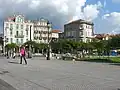 To the west of the square are two remarkable Art Nouveau buildings. The Art Nouveau building at number 8, further south, is the older of the two. It was designed by the architect Andrés López de Ocáriz Robledo, who completed the project in June 1912.[16] The building was promoted by Juan Pazos, a rich emigrant who returned from America, who bought four of the five small 15th-century houses that bounded the square to the west and which were demolished.[17] It consists of a ground floor with double-height arcades, three floors and an attic. Art Nouveau decoration with floral and geometric motifs appears on the main façade above and below the doors and windows, as well as on the central curved pediment with a semicircular arch and on the cornices on either side of it.[16] The building has two large central wrought iron balconies on the first two floors and four side balconies on the third floor. It was completely renovated in 2007 by the architects César Portela and Enrique Barreiro Álvarez.[18]