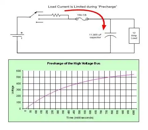 If the example circuit from before is used with a pre-charge circuit which limits the dV/dT to less than 600 volts per second, then the inrush current will be reduced from 670 amperes to 7 amperes. This is a "kinder and gentler" way to activate a high voltage DC power distribution system.