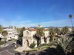 The current church building stands on a v-shaped corner of Occidental Blvd. and Hoover St., dedicated in November 1926. It is an Italian Romanesque structure. The church has three rose windows that offer a dim and religious life. Twelve large stained glass windows, six yellow windows and the Stations of the Cross Mosaics are over the nave.[1] The church structure is entirely made of poured concrete. The ceiling beams are painted to look like wood, but are actually concrete. The church was remodelled in 1951 by Wallace Neff who commissioned Millard Sheets to create the mosaics in the apse. Neff also added a parish hall.[5]