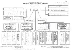 Section 4 of this article was added in 2003; the remainder dates to 1991. The prefect's role is further defined by a 2004 law, modified by decrees in 2004 and 2005, and by a law in 2006.[8] Among the roles of the office is to ensure that the Constitution and laws are followed; to help fulfil the Government's programme; to help maintain social peace; to cooperate with local authorities in order to set development priorities; to verify the legality of acts done by the county or local councils and mayors; to ensure emergency preparedness; to promote integration into the European Union; to decide with which similar institutions in Romania or abroad to cooperate; to ensure that national minorities are able to communicate with Government institutions in localities where minorities make up over 20% of the population. The principles that are supposed to guide the prefect are legality, impartiality and objectivity; transparency and free access to public information; efficiency; responsibility; professionalism; and a citizen-oriented attitude.[9] The Interior Ministry is the principal allocator of prefectures' budgets, while their activity is coordinated by the Prime Minister and they are subordinate to the Government.[10]