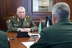 Though Russia formally played the role of mediator in the conflicts between Georgia, Abkhazia, and South Ossetia, it enjoyed a strong influence in the separatist governments years before 2008 and exerted control via key security officials and financial assistance to what Tbilisi called "Russian proxy regimes".[181] In Abkhazia, these officials included, before 2008, Deputy Defense Minister Alexander Pavlyushko (previously head of the Russian peacekeeping contingent in the region), Chief of General Staff Anatoly Zaitsev (also a high-ranking official in the Russian Ministry of Defense), and Deputy Security Council Secretary Alexander Voinsky (also a Commander in the Russian Navy).[182] In South Ossetia, the power elite was described by Russian journalist Julia Latynina as a "joint business venture between KGB generals and Ossetian entrepreneurs using money allocated by Moscow",[183] while the Kremlin was thought to hold a "direct line" with the office of local leader Eduard Kokoity, though questions remain as to who exerted influence on the latter from the Russian side, and all security-related decisions were made by Russian officers.[184] In early 2008, the key South Ossetian leaders thought to be appointed by Moscow included Interior Minister Mikhail Mindzaev (a Colonel of the Russian Militsiya), Security Council chairman Anatoly Barankevich (a Russian Army Colonel), State Security Committee chairman Boris Atoev (a Russian citizen and former Soviet-era intelligence official), and Border Security Head Valery Chugunov (also a Lieutenant General of the FSB).[185] Kokoity's cabinet staff included high-ranking GRU officials, such as former Russian Deputy Interior Minister Sergey Shadrin, who worked as a law enforcement adviser to Kokoity.[186] On 1 March 2008, Russian Major General Vasily Lunev transitioned from Deputy Commander of the Siberian Military District to Minister of Defense of South Ossetia, a position he later admitted having taken as an "order from his superior".
