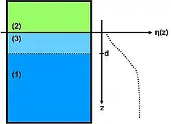 Where is the order parameter at the border between (2) and (l), the so-called extrapolation length and a constant that enters the model and has to be determined using experiment and other models. Hence one can see that the order parameter in the liquid film can undergo a continuous phase transition for large enough extrapolation length. A further result is that what corresponds to the result of the thermodynamical model in the case of short range interactions. Landau Theory does not consider fluctuations like capillary waves, this could change the results qualitatively.[6]