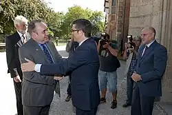 With the support of the Greens, Salmond was elected by the Scottish Parliament as First Minister on 16 May 2007, and was sworn in the following day after receiving the Royal Warrant from the Queen and taking the official oath of allegiance before judges at the Court of Session.[3][4] Salmond became the first nationalist politician to hold the office of First Minister and it was the first time an incumbent First Minister was defeated from office.[5]