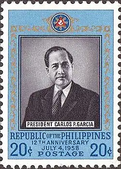 Carlos Polestico Garcia KR (Tagalog: [ˈkaːɾ.los poˌlɛːs.tɪˈxo gɐɾˈsiː.ɐ]; November 4, 1896 – June 14, 1971), often referred to by his initials CPG, was a Filipino teacher, poet, orator, lawyer, public official, political economist, guerrilla and Commonwealth military leader who was the eighth President of the Philippines from 1957 to 1961. He previously served as the fourth Vice President of the Philippines from 1953 to 1957.