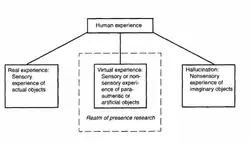 Presence has been delineated into subtypes, such as physical-, social-, and self-presence.[1] Lombard's working definition was "a psychological state in which virtual objects are experienced as actual objects in either sensory or nonsensory ways."[2] Later extensions expanded the definition of "virtual objects" to specify that they may be either para-authentic or artificial. Further development of the concept of "psychological state" has led to study of the mental mechanism that permits humans to feel presence when using media or simulation technologies.[1] One approach is to conceptualize presence as a cognitive feeling, that is, to take spatial presence as feedback from unconscious cognitive processes that inform conscious thought.[7]