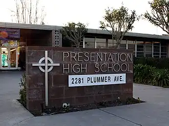 Presentation High School is a private, Catholic, college preparatory school for girls established in 1962. It is owned and run by the Sisters of the Presentation, and operates within the Diocese of San Jose in California. The school is located in the Willow Glen area of San Jose, California, United States. Students come to Presentation from 154 different schools in 62 zip codes around the Bay Area.[3] On top of being superior in academics, Presentation High School also offers more than 60 diverse clubs, teams, programs and affinity groups for its students to choose from. The Robotics Club (Team 2135) is recognized by the FIRST Robotics Competition. This helps young women explore the STEM fields by hands-on engineering, programming and design.
