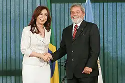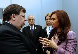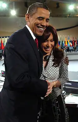 In September 2010, it was announced that Argentina was elected president of the Group of 77+China and prepared to act as a ‘bridge" with G-20 major economies to which it also belongs.[82] She visited Chile during their Bicentenary celebrations where she also assisted at the baptism of a Chilean baby, Anaís Escobar Maldonado, born in the Argentine Hospital deployed at Curico after the earthquake. The visit had a high profile in the media mainly because of the possible extradition to Chile of Sergio Apablaza. She met with president Sebastián Piñera and participated in the festivities at the national stadium.[83] She also confirmed the celebration of the III bi-national cabinet meeting for next October.[84][85] Fernández de Kirchner then departed for New York to give her United Nations General Assembly speech where she once again criticized Britain over the Falklands (Malvinas) issue, and Iran for the 1994 AMIA bombing whilst giving her support for an Israeli-Palestinian dialogue and an eventual Palestinian state.[86] On 30 September she hosted the UNASUR presidents' emergency summit at Buenos Aires due to the Ecuador crisis and started an official visit to Germany the following day in order to participate as a Guest of Honour at the Frankfurt Book Fair[87] and meet with Chancellor Angela Merkel. In October she inaugurates the III News Agencies World Congress to be held in Bariloche.[88] This same month, and as part of the 2006 civilian nuclear-power reactivation program, Fernández reopened the Pilcaniyeu uranium enrichment plant, put on ice in the 1990s, amid worsening shortages of natural gas.[89] Following the death of her spouse (see below), she also resumed activities and flew to South Korea for the G20 Seoul summit. After her return she announces that the Paris Club agrees to debt talks without the International Monetary Fund intervention as proposed by Argentina since 2008. These negotiations will result in the settlement of the last portion of the sovereign debt defaulted in the 2001 crisis after the successful restructuring debts of 2005 and 2009.[90] In November she also participated in the UNASUR Summit at Guyana after which will host the XX Ibero-American Summit at Mar del Plata.