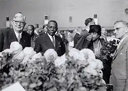 In foreign policy, Tubman aligned his country with the US, which he hailed as "Our strongest, closest, and most reliable friend."[15] In June 1944, he and former president Edwin Barclay traveled to the White House as guests of President Franklin D. Roosevelt, and became the first African heads of state to be received there.[3] Following the war, which resulted in an anti-colonial movement on the African continent, Tubman strengthened ties among fellow Africans by participating in the Asian-African Conference of 1955, and the First Conference of Independent African States in Accra, organized in 1958 by Kwame Nkrumah of Ghana.[16] In 1959, Tubman organized the Second Conference of African States.[17][18]