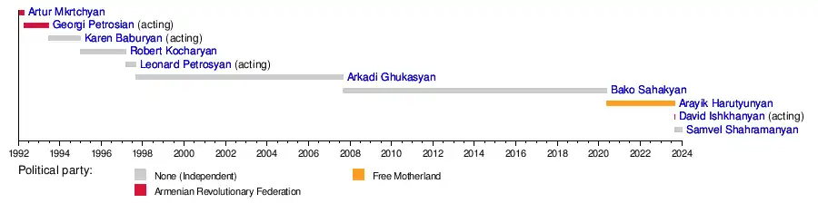 | 4 | Arayik Harutyunyan (born 1973) | 21 May 2020 | 1 September 2023 | 3 years, 103 days | Free Motherland | 2020 | |