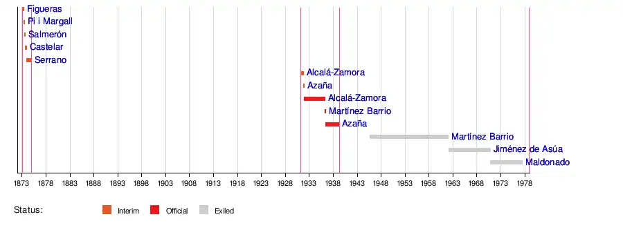 President of the Republic (Spanish: Presidente de la República) was the title of the head of state during the Second Spanish Republic (1931–1939). The office was based on the model of the Weimar Republic, then still in power in Germany, and a compromise between the French and American presidential systems.[1] The "Republican Revolutionary Committee" set up by the Pact of San Sebastián (1930),[2] considered the "central event in the opposition to the monarchy of Alfonso XIII",[3] and headed by Niceto Alcalá-Zamora, eventually became the first provisional government of the Second Republic, with Alcalá-Zamora named President of the Republic on 11 December 1931.