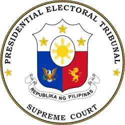 The Presidential Electoral Tribunal (PET) is an electoral tribunal that decides election protests involving the election of the President of the Philippines and Vice President of the Philippines.[2] It is composed of justices of the Supreme Court of the Philippines. The equivalent tribunals for the Congress of the Philippines are House of Representatives Electoral Tribunal and the Senate Electoral Tribunal.
