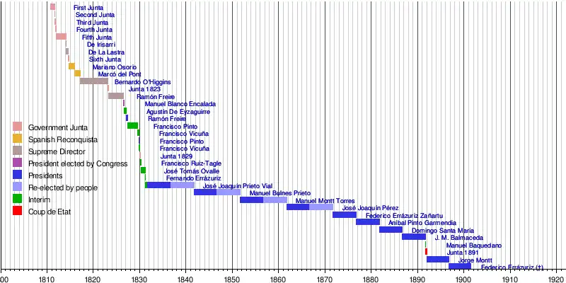The timeline shows changes, both personal or title, of the head of state and the head of government of the Republic of Chile from 18 September 1810 until today, regardless of whether president, vice-president, supreme director, interim or junta.