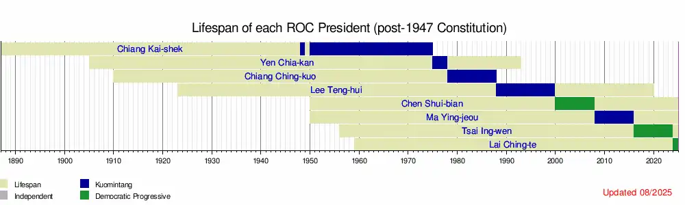 This is a graphical lifespan timeline of the presidents of the Republic of China (post-1947 Constitution) and they are listed in order of office.