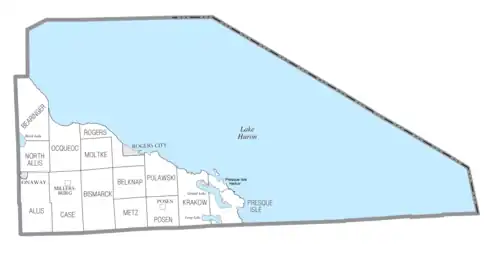 Presque Isle County (/ˈprɛskiːl/ PRESK-eel) is a county in the Lower Peninsula of the U.S. State of Michigan. As of the 2020 census, the population was 12,982.[2] The county seat is Rogers City.[3] The county was authorized by State legislation on April 1, 1840,[4] but the county government was not established until 1871. The government was reorganized in 1875.[1] The name is an anglicisation of the French word presqu'île or presque-isle, which means a specific kind of peninsula with a very narrow isthmus or connection to another landform, denominated a "presque-isle", i. e., literally "almost an island".[1] A large part of Presque Isle Township consists of that peninsula, with Lake Huron on the east, Grand Lake on the west, and narrow strips of land connecting it to the mainland at the north and south ends. The community of Presque Isle is near the center of this peninsula.