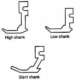 Different manufacturers have produced machines with one of three types of presser foot shank in mind. These are the low shank, high shank, and the slant shank presser foot. A low shank presser foot has a 0.5 inches (13 mm) distance from the bottom of the foot to the center of the thumbscrew; a high shank foot has a 1 inch (25 mm) distance; a slant shank foot is distinctly slanted. The kind of foot a given machine requires is not interchangeable: a low-shank machine will only accept a low shank presser foot, and a high shank machine only a high-shank presser foot, though within these categories any low shank or high shank foot will fit any corresponding low shank or high shank machine; exceptionally, a slant shank foot can only be used with a Singer slant needle machine and no other (likewise, such a machine can accept no other kind of foot).