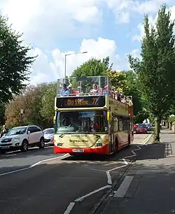 Bus routes operated by the Brighton & Hove Bus Company operate along Dyke Road. Route 27 runs between Westdene and Saltdean via Brighton station, Old Steine and Rottingdean.[47] Some services on routes 14 and 14C run along Dyke Road on their journeys between Hangleton and Peacehaven.[48] The weekend-only route 77 service between Brighton Pier and Devil's Dyke runs approximately every 45 minutes along the whole length of Dyke Road.[49] Bus journeys to the centre of Brighton take around 10 minutes.[2]