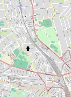 Prestonville has convenient access to rail services.[31] Brighton railway station is near the southeast corner of the area. Its dramatically curving train shed can be seen from some of the nearby terraced streets. At the northeast corner of the area is Preston Park railway station, the first station outside Brighton on the main line to London. There is a rear entrance to the station at the junction of Woodside Avenue and Tivoli Crescent North.[46] The railway line runs at a much lower level below the ridge and forms the eastern boundary of the Prestonville area.[2]
