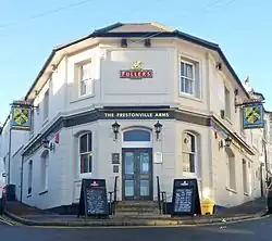 Prestonville covers a sloping ridge of land on the western side of the valley through which London Road and the Brighton Main Line run. The land drops down steeply from Dyke Road, the ancient route to Devil's Dyke on the South Downs.[2] Now one of the city's major roads, it formed the historic boundary between the parishes of Hove and Preston. Later, when Preston became part of Brighton, Dyke Road formed the border between the Boroughs of Hove and Brighton.[3] The centre of Brighton is about 1.2 miles (2 km) to the southeast, and central Hove lies to the southwest.[2]
