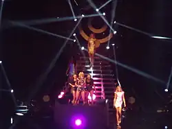 A day before the release of No Boys Allowed, Hilson performed the song at Billboard's first live Tastemakers event in New York City on December 20.[64] On January 4, 2011, Hilson gave a Motown-themed performance of "Pretty Girl Rock" on the Late Show with David Letterman, by paying tribute to Diana Ross and The Supremes with her two female back-up singers.[65] On January 25, she performed "Pretty Girl Rock" on The Ellen DeGeneres Show, also mixing Blunt's "You're Beautiful" into the song.[66] Backed by four female dancers, Hilson wore a white button-down shirt, knee-length pants and black heels.[66] Robbie Daw from Idolator wrote that, "Keri Hilson amped up the sex factor."[67] In April 2011, Hilson performed "Pretty Girl Rock" during her set at the Supafest Festival in Australia, dressed in a denim jacket, black bra and cutoff shorts.[68] On June 9, Hilson performed a remix of the song on the finale of Germany's Next Topmodel, as models strutted down the runway.[69] The song was added to Hilson's set list on Lil Wayne's I Am Still Music Tour in North America in July 2011, in which she served as an opening act.[70] It was also included to the set list of Hilson's first headlining European tour in October 2011.[71]