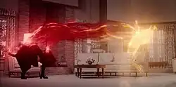 ![]() Wanda Maximoff (L) creates Vision (R) in a sequence created by visual effects vendor Industrial Light & Magic; inspiration was taken from a scene in Avengers: Age of Ultron (2015) where Maximoff's magic comes directly from her chest and heart.[1] | |